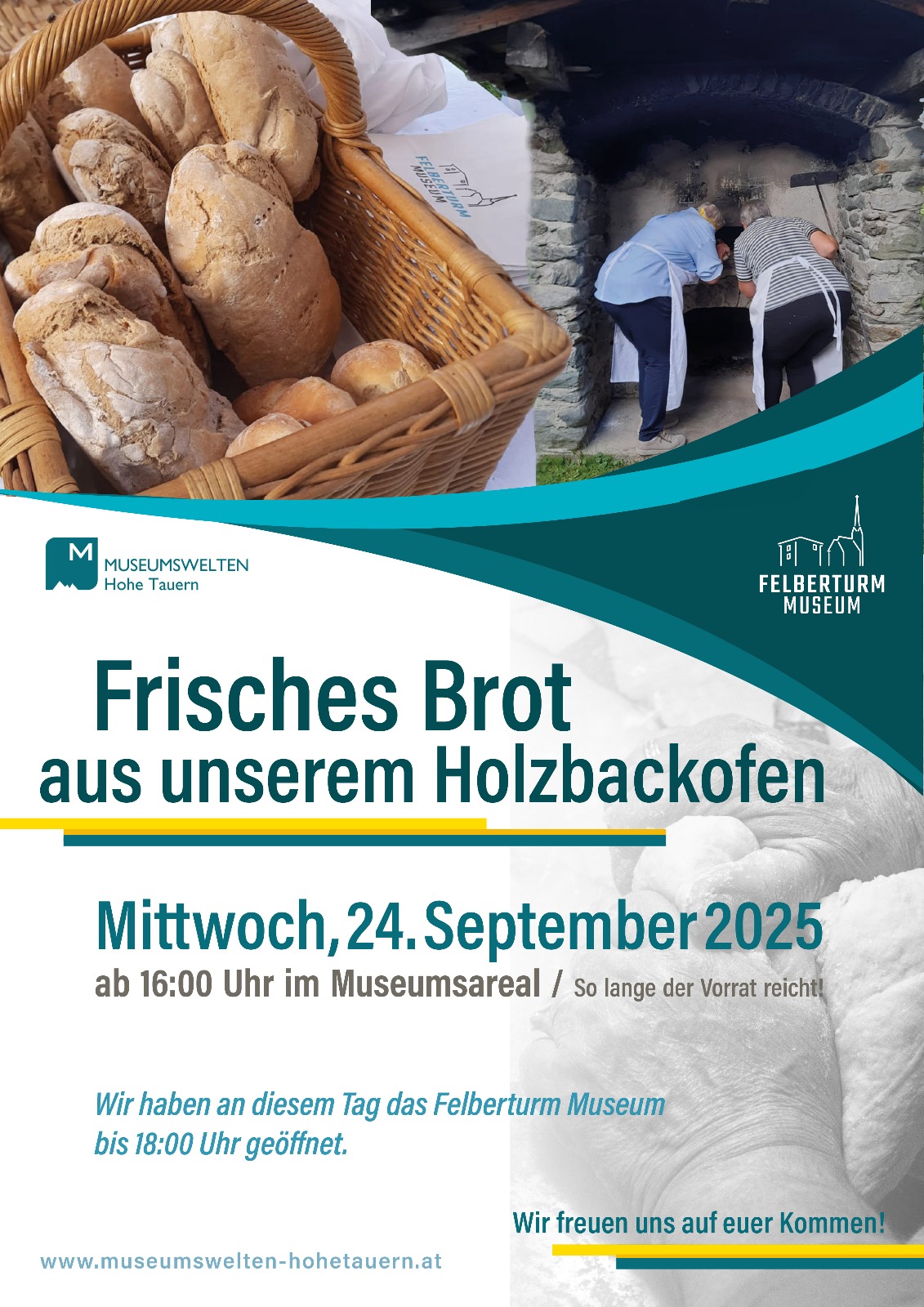 Kommen Sie vorbei und holen Sie sich ihr selbstgemachtes Brot frisch aus dem Holzbackofen. Zusätzlich können Sie einen Blick in unser Museum und die Sonderausstellung werfen, das Felberturm Museum hat an diesem Tag bis 18 Uhr geöffnet.