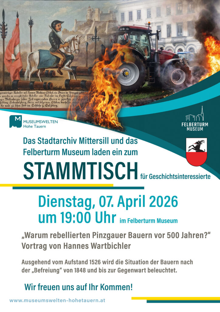 Am Dienstag, 07. April laden das Stadtarchiv Mittersill und das Felberturm Museum zum nächsten Museumsstammtisch ein: „Warum rebellierten Pinzgauer Bauern vor 500 Jahren?“ Vortrag von…